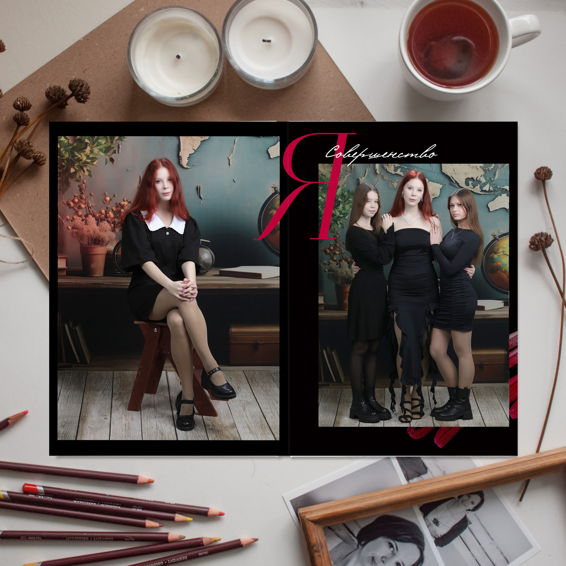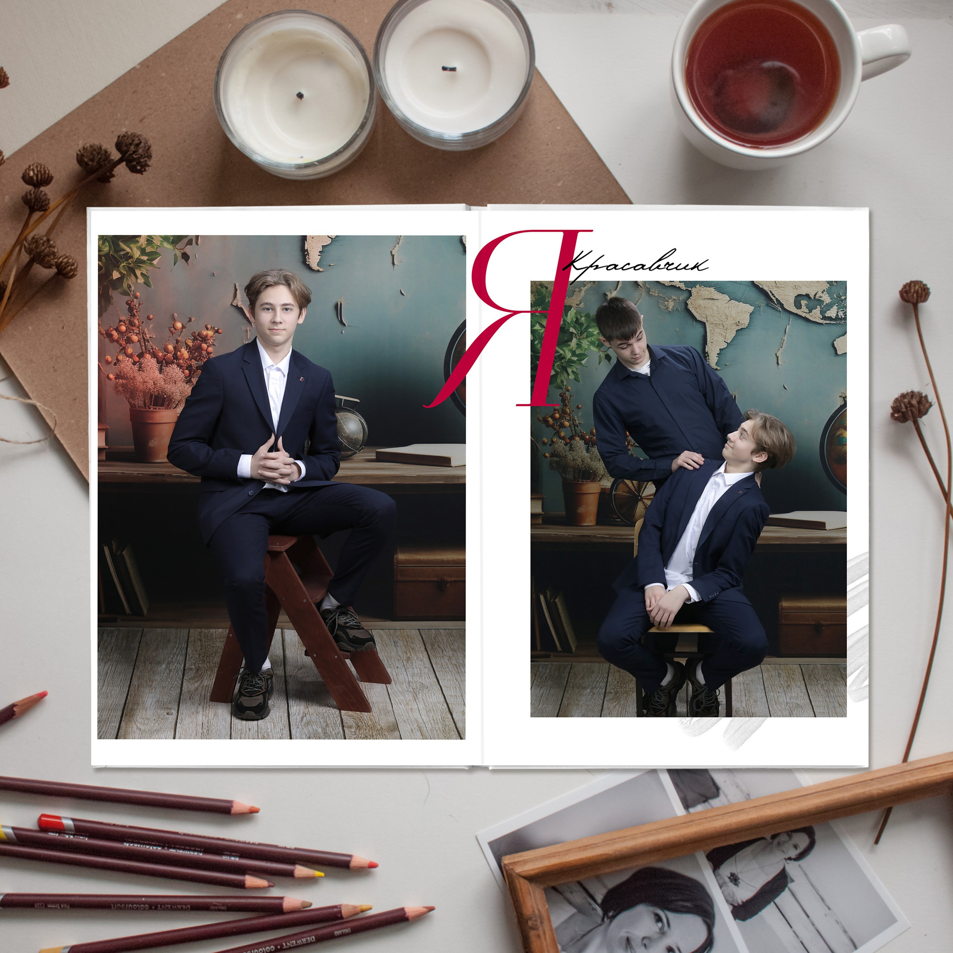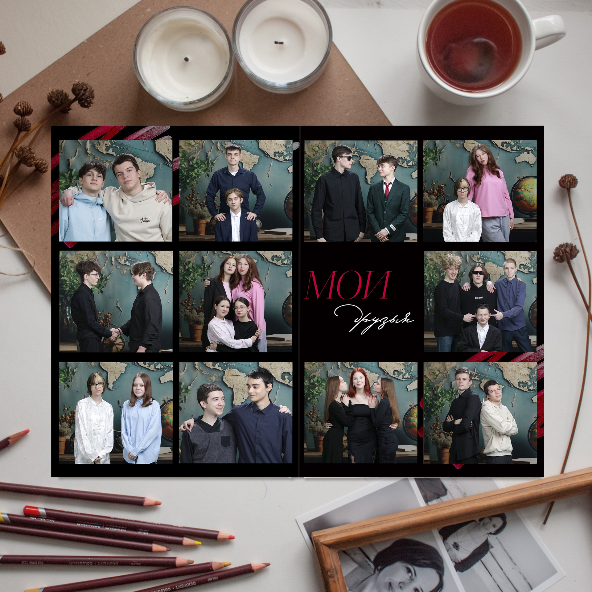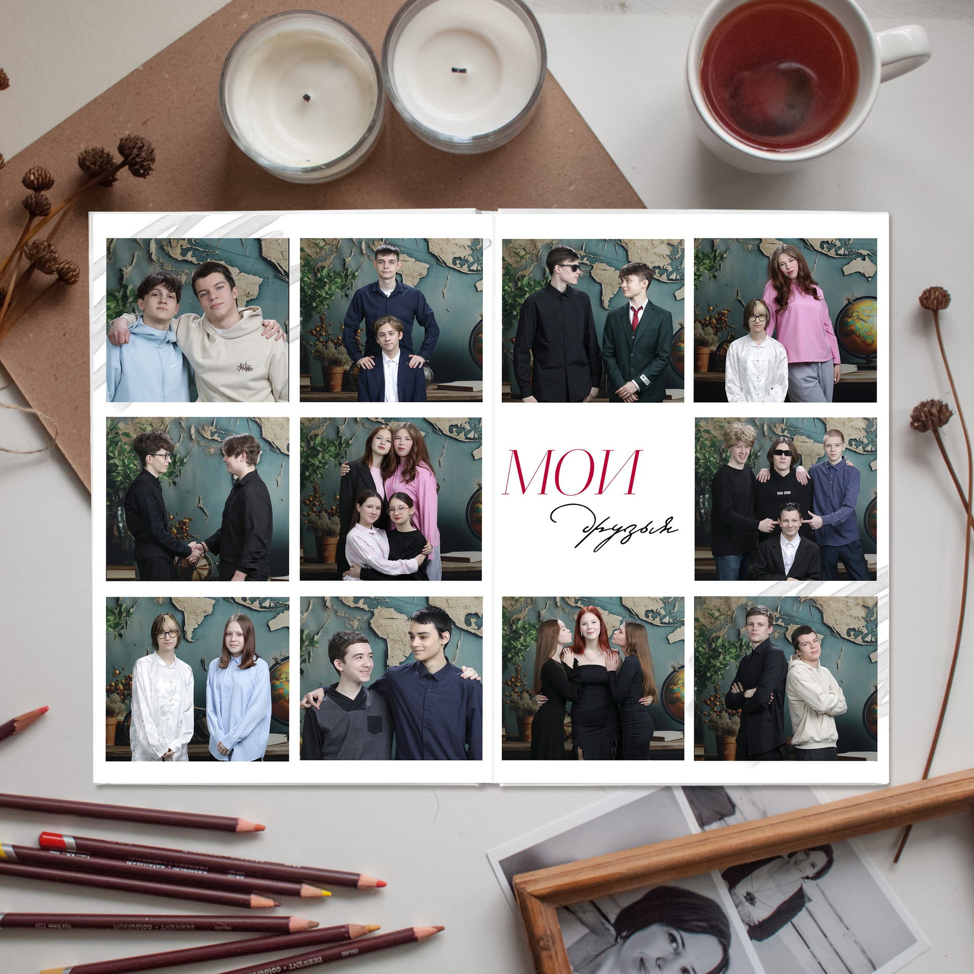 1 разворот - портрет + фото с другом/ подругой