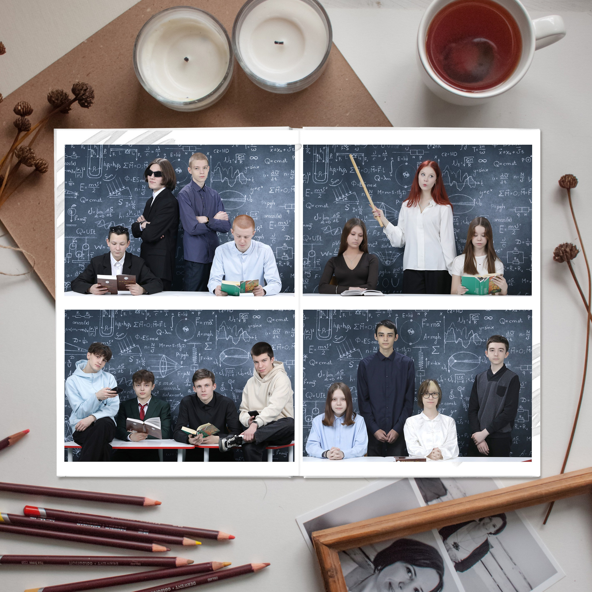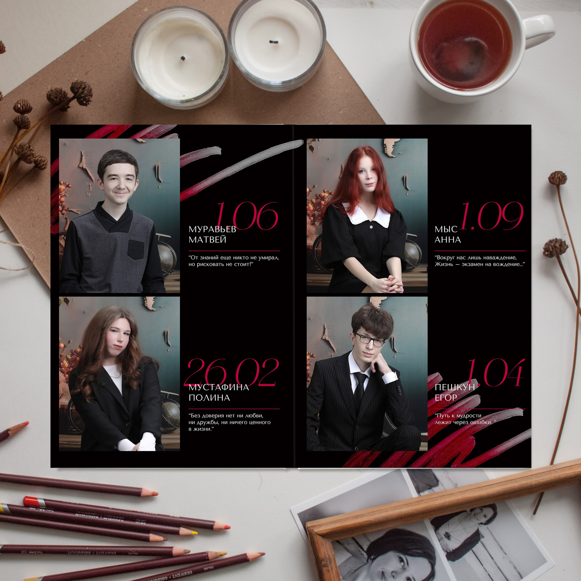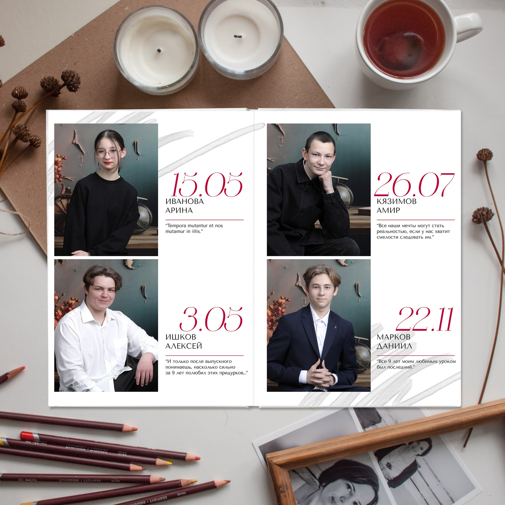 3 - 6 развороты - виньетка (мини-портреты по 4 человека на разворот. Количество разворотов зависит от количества человек в классе. Каждый дополнительный разворот виньетки + 100 рублей)