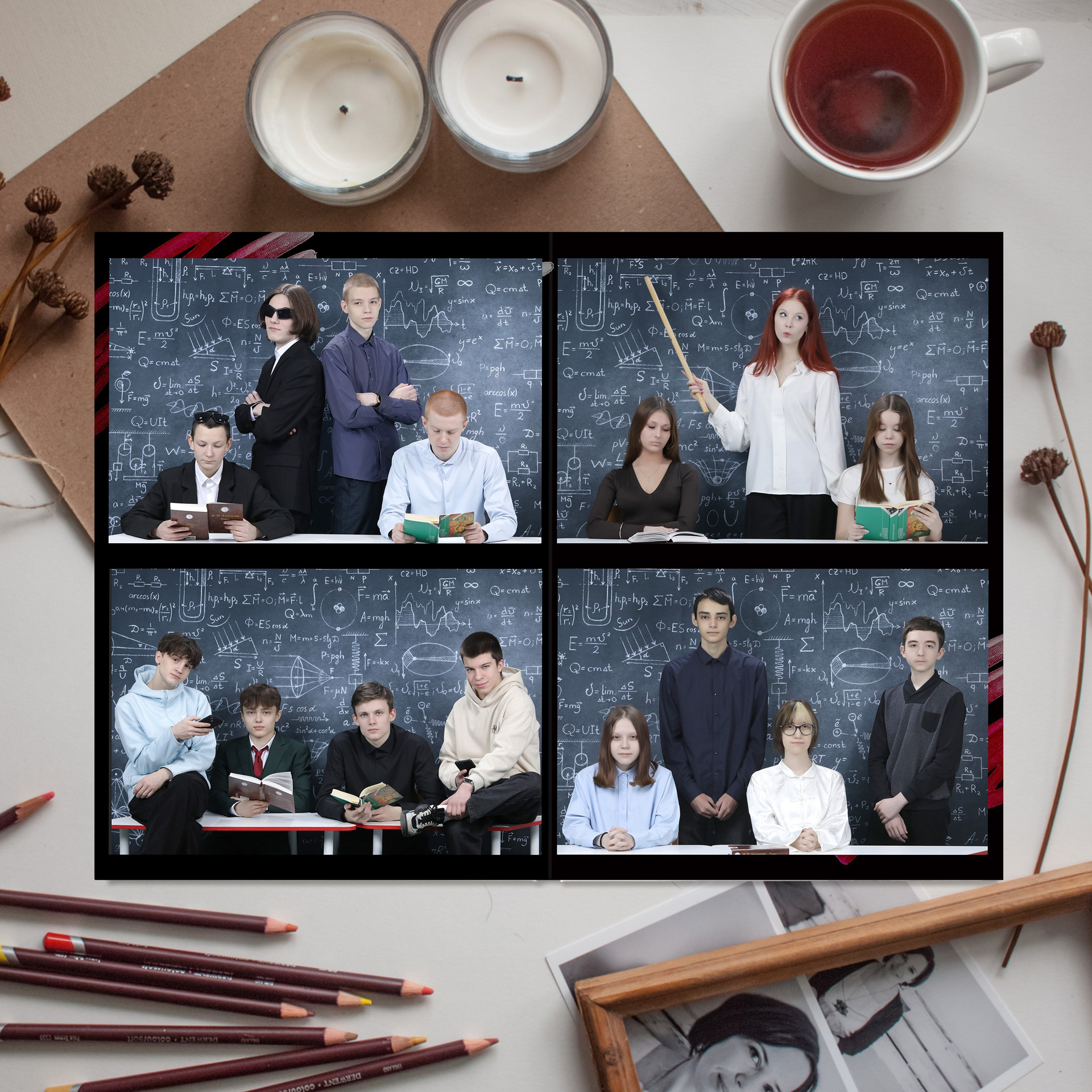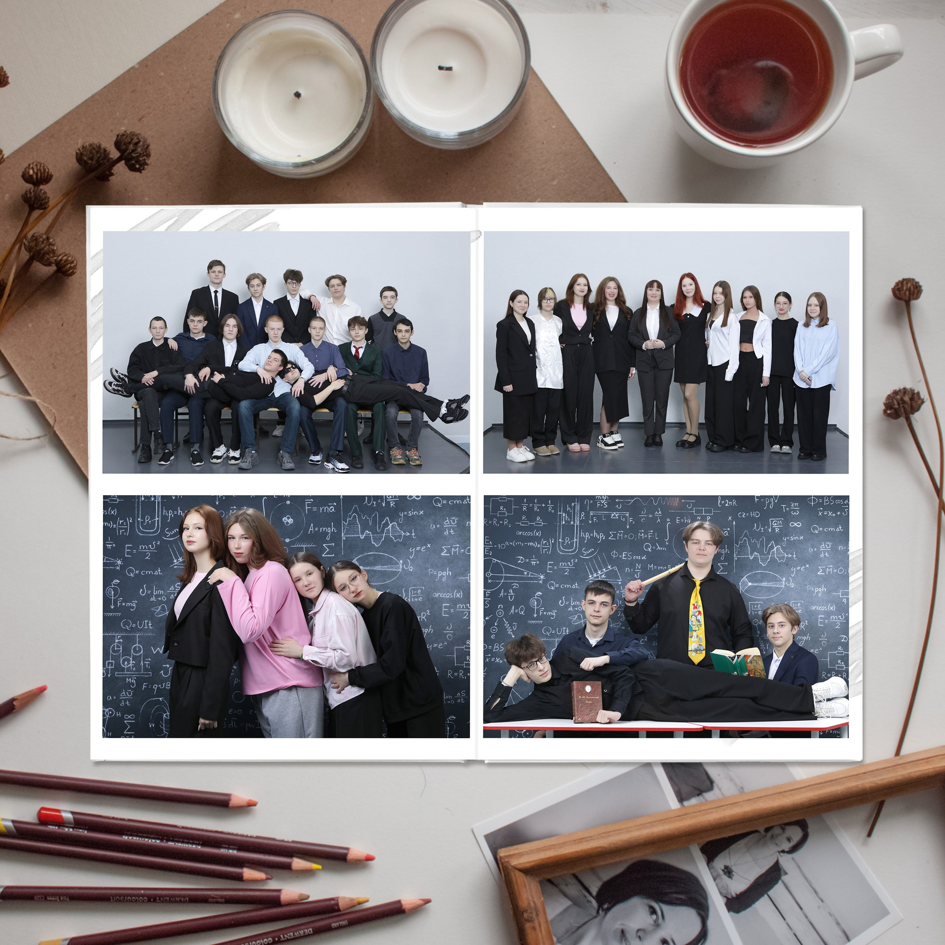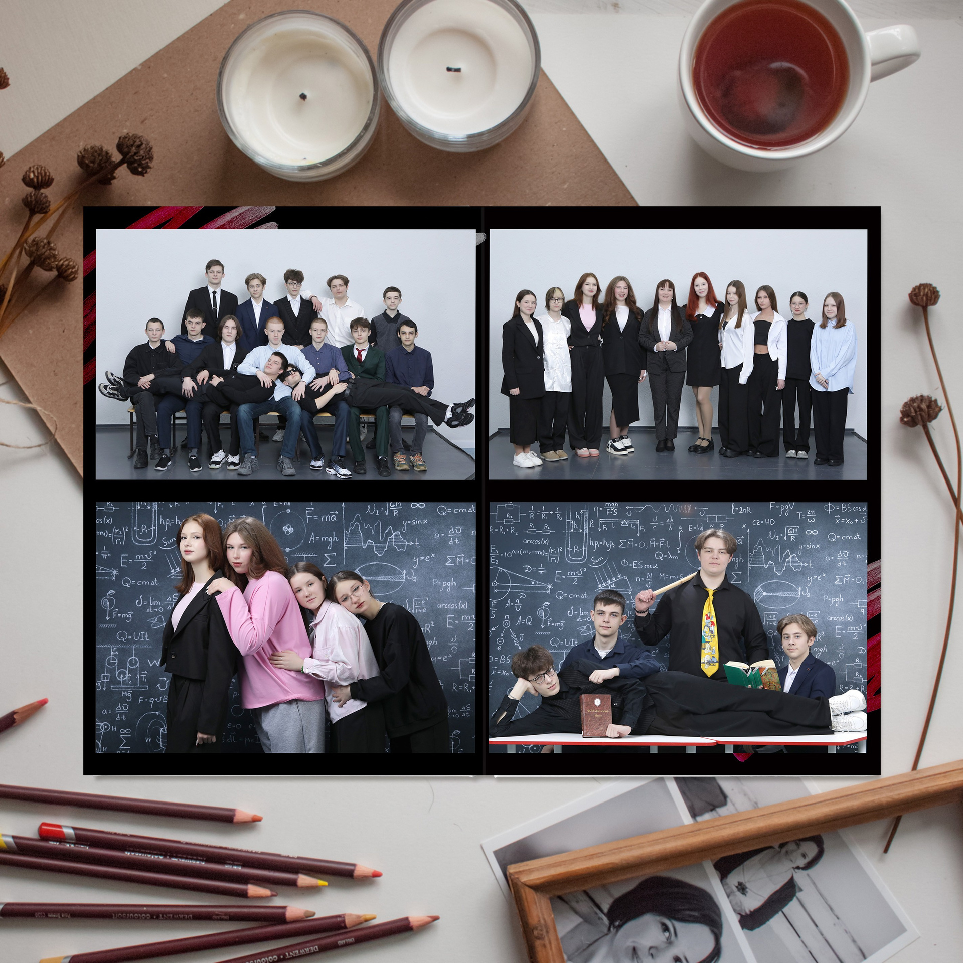 3 - 6 развороты - виньетка (мини-портреты по 4 человека на разворот. Количество разворотов зависит от количества человек в классе. Каждый дополнительный разворот виньетки + 100 рублей)