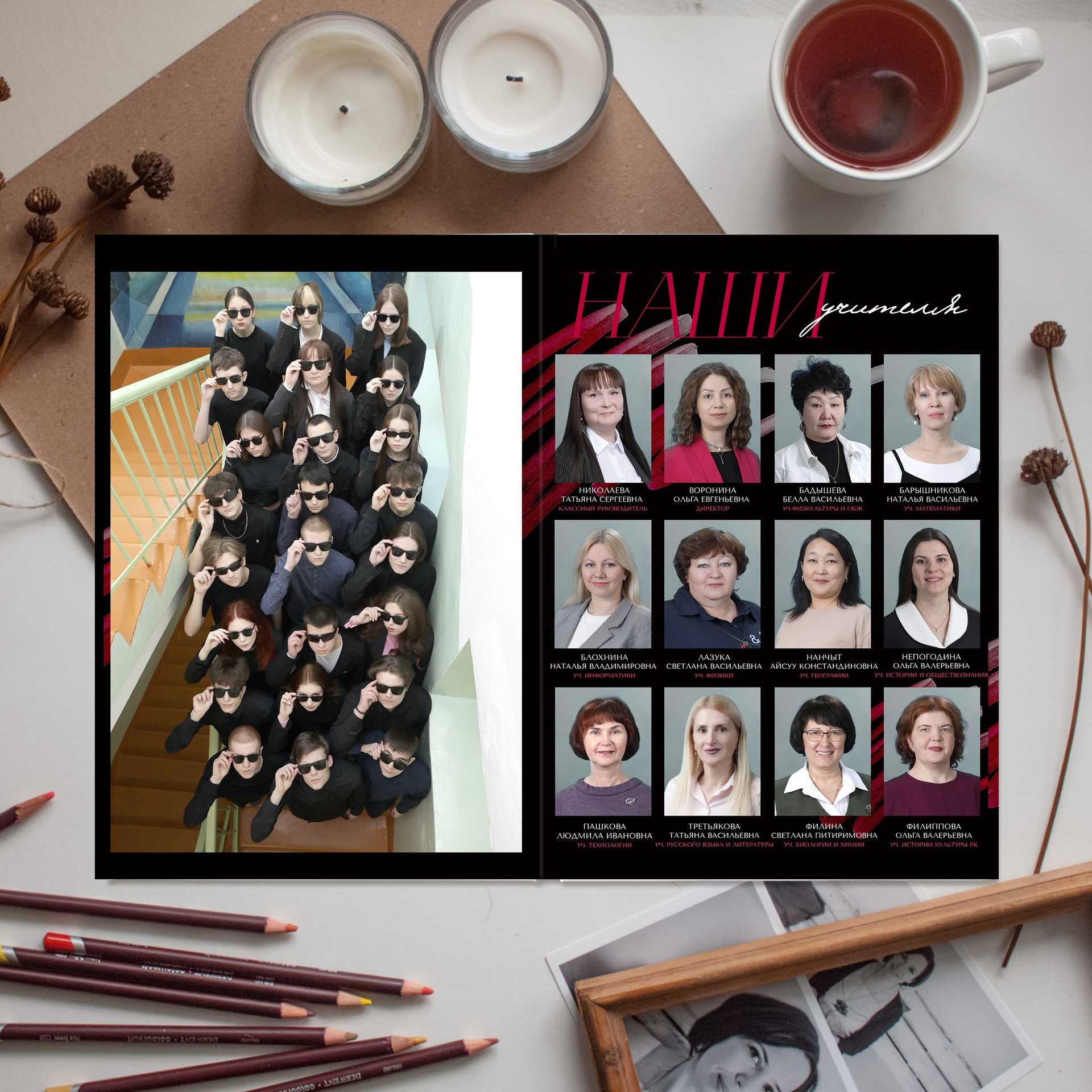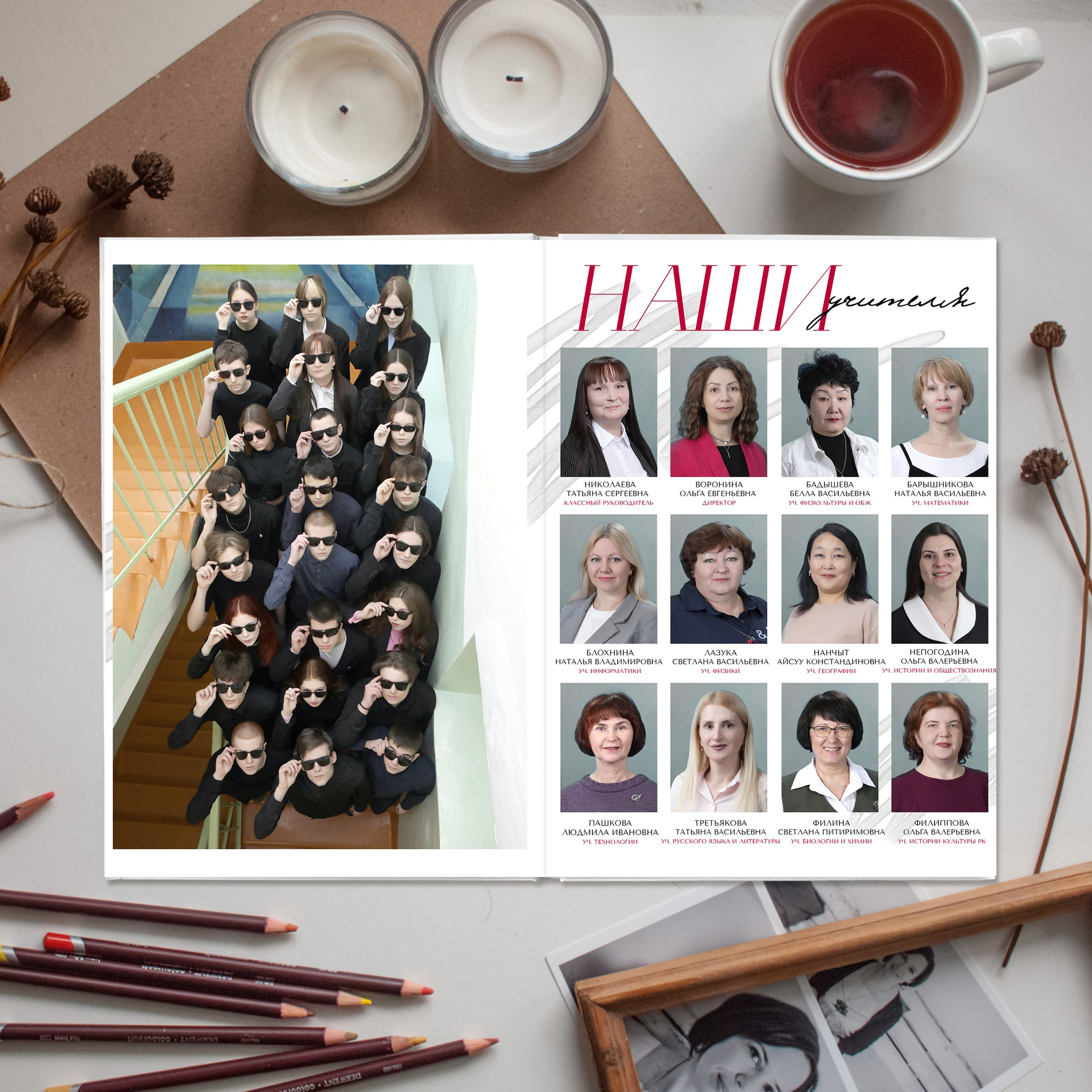 2 разворот - общее фото на лестнице + учитель/ля